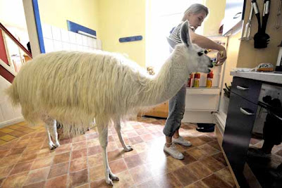 La mujer alimenta a Socke en la cocina de su apartamento.